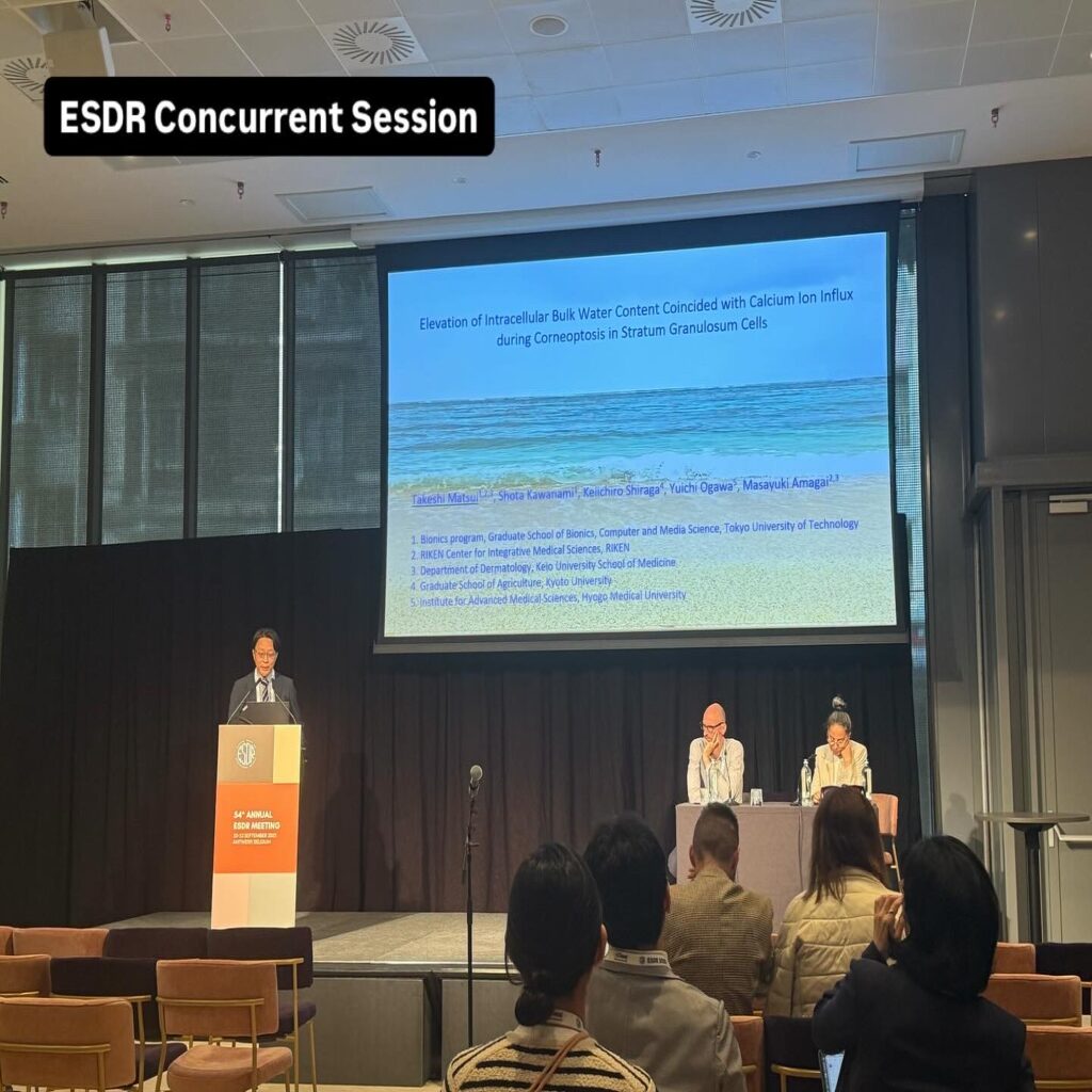 On Sunday, December 8, 2024, Shota Kananami, a second-year master’s student, gave an oral presentation in English titled “Linking intracellular bulk water increase to elevated calcium levels during corneoptosis in stratum granulosum cells” during the plenary session on the final day of the 49th Annual Meeting of the Japanese Society for Investigative Dermatology, held at Winc Aichi in Nagoya. His presentation analyzed the timing and characteristics of intracellular water molecule changes during cell death in stratum granulosum cells. Professor Takeshi Matsui also delivered an oral presentation during a concurrent session titled “Three distinct ultrastructural stages of dying epidermal stratum granulosum cells during corneoptosis revealed by high-pressure freezing”, in which he discussed electron microscopy techniques used to observe morphological changes in dying stratum granulosum cells. Third-year undergraduate student Kuga Kobayashi also attended the conference.