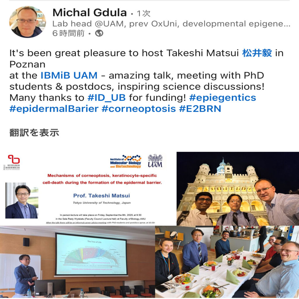 • 9月8日に、Adam Mickiewicz University(Poznań, Poland)のInstitute of Biotechnology and Molecular Biologyにおいて、Dr. Michał Gdulaのご招待で、Molecular mechanism of corneoptosis, keratinocyte-specific cell death during the formation of the epidermal barrierと題してセミナーを行いました。