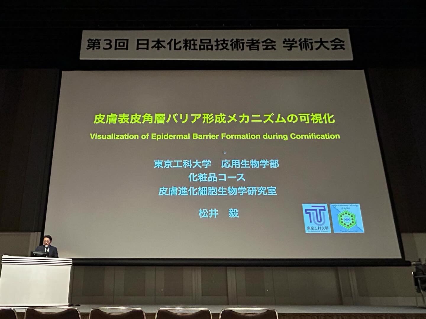 - 2025年12月10日にパシフィコ横浜(神奈川県横浜市)で開催された第3回日本化粧品技術者会学術集会において、松井毅教授が「皮膚表皮角層バリア形成メカニズムの可視化」と題して基調講演を行いました。また、修士課程1年の佐藤七緒さんも、「未利用資源ユズさのうエキスはケラチノサイトの細胞内 Ca2+濃度上昇を促す」と題して、ポーラ株式会社様との共同研究成果を口頭発表しました。